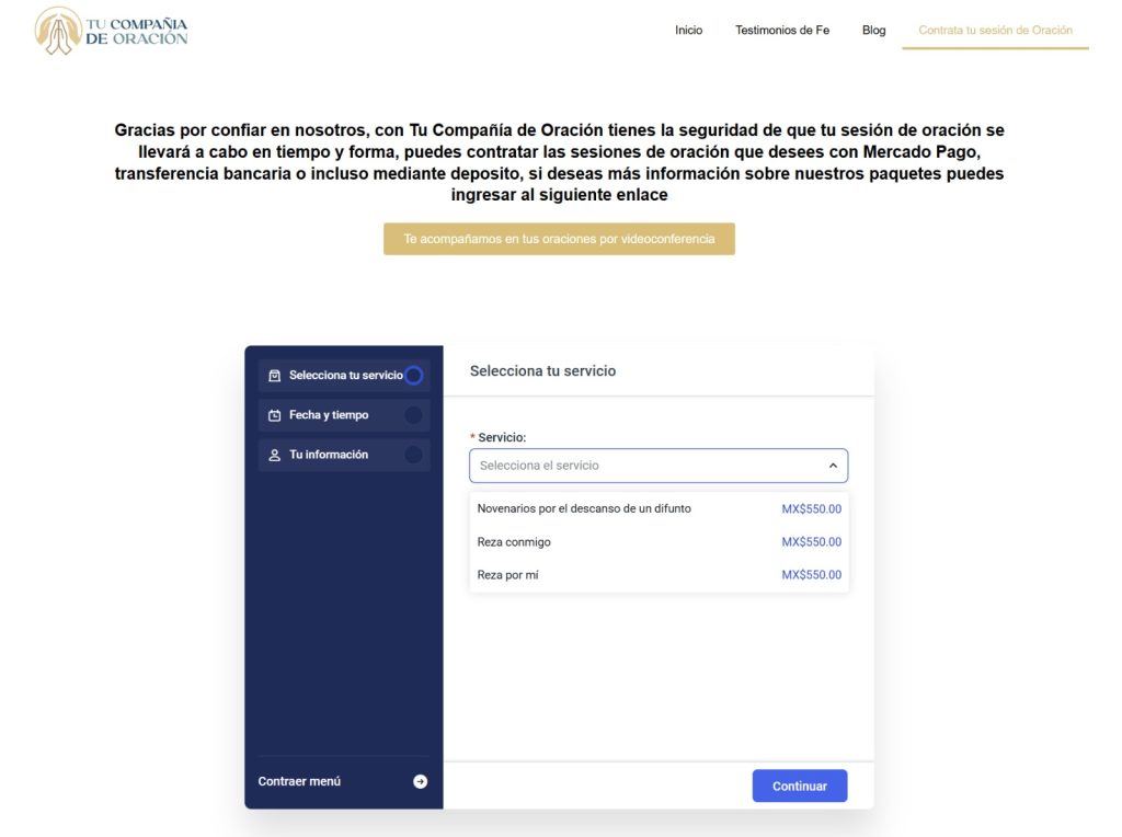 Contratar tu sesión privada de oración es muy sencillo, solo necesitas depositar o transferir la tarifa y agendar la hora y fecha, también lo puedes hacer por medio de la aplicación Mercado Pago, nuestra plataforma te acompaña paso a paso, desde luego obtienes un comprobante de pago e incluso lo puedes hacer a meses sin intereses, en caso de que por cualquier causa atribuible a nosotros tu sesión no se lleve a cabo se te devolverá el monto total que pagaste (en caso de que no desees reprogramar).