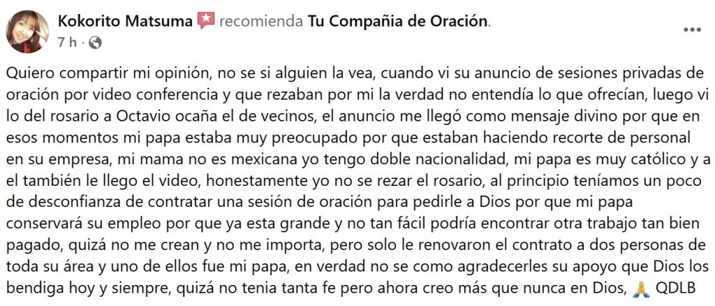 En caso de que optes por la opción reza por mi y por cualquier circunstancia no puedas participar en tu sesión, o simplemente desees que recemos por ti mientras tu enfrentas alguna situación, guardamos el video y te compartimos el enlace para que lo puedas ver las veces que quieras, en donde desees.