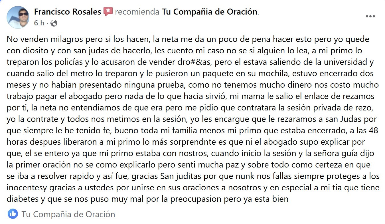 Nuestra labor esta llamando mucho la atención de las personas, nuestro objetivo principal es brindar guía y acompañamiento integral y efectiva en sus oraciones a todas las personas mediante sesiones privadas de video llamada, para cumplir con nuestra misión contamos con dos herramientas primordiales, la primera y más importante son nuestras Guías Rezadoras, mujeres que poseen la vocación, la fe, la devoción y la experiencia que dan los años de dedicarse a esta importante actividad, la segunda es nuestra tecnología para garantizar que las sesiones sean absolutamente únicas, personalizadas y cálidas.